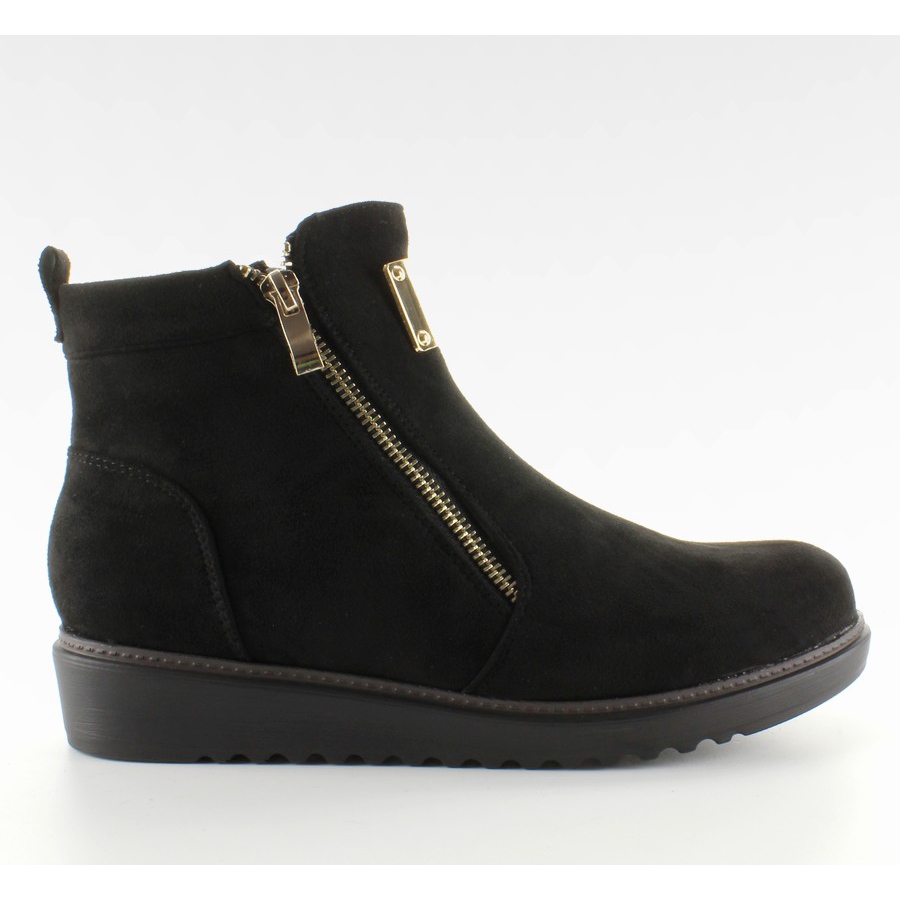Bottes en daim avec plaque dorée GG-32 Noir - bottes pour femmes élégantes et confortables, parfaites pour les journées les plus froides. Fabriqué en daim écologique de couleur noir classique, avec une plaque dorée accrocheuse sur la languette et des fermetures éclair dorées qui ajoutent du caractère et une brillance subtile.