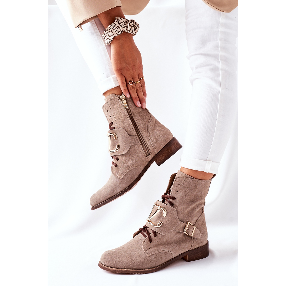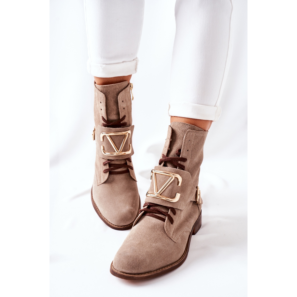 Les chaussures sont en daim naturel. La décoration sous la forme d'une grande boucle et de lettres dorées souligne magnifiquement leur style unique. Il sera plus facile d'enfiler la fermeture éclair cousue sur le côté, tandis que les lacets assureront un meilleur maintien. Boots reposant sur un délicat talon plat. Lorsque vous choisissez une taille, veuillez utiliser le tableau des tailles.