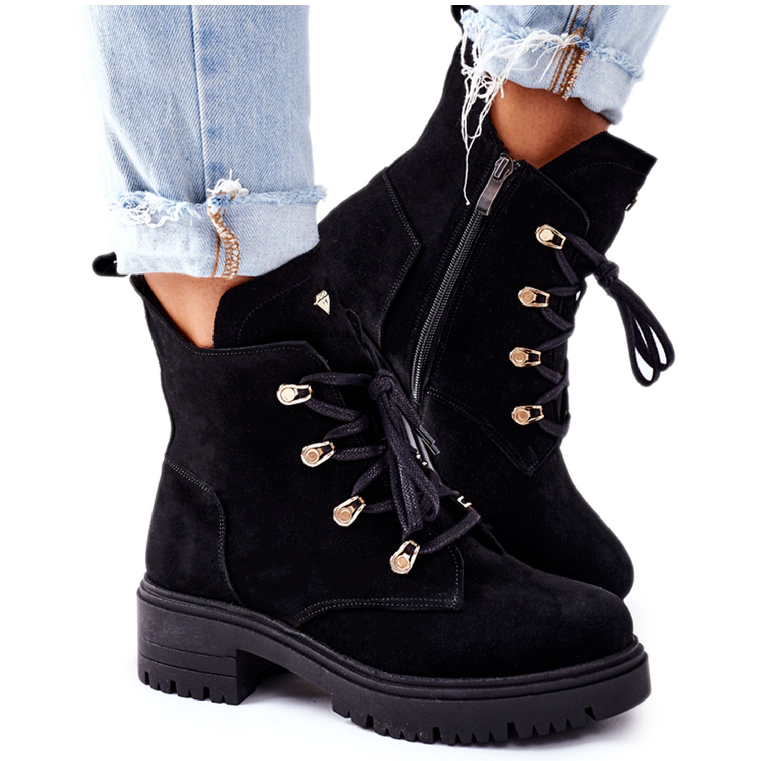 Des bottes noires classiques en daim naturel, qui combinent un look élégant avec des solutions pratiques. Le logo doré ajoute un style subtil, et le réchauffement et un insert en cuir offrent un confort les jours plus frais. Parfait pour la saison automne / hiver - pour le travail, pour les promenades et les stylisations urbaines.