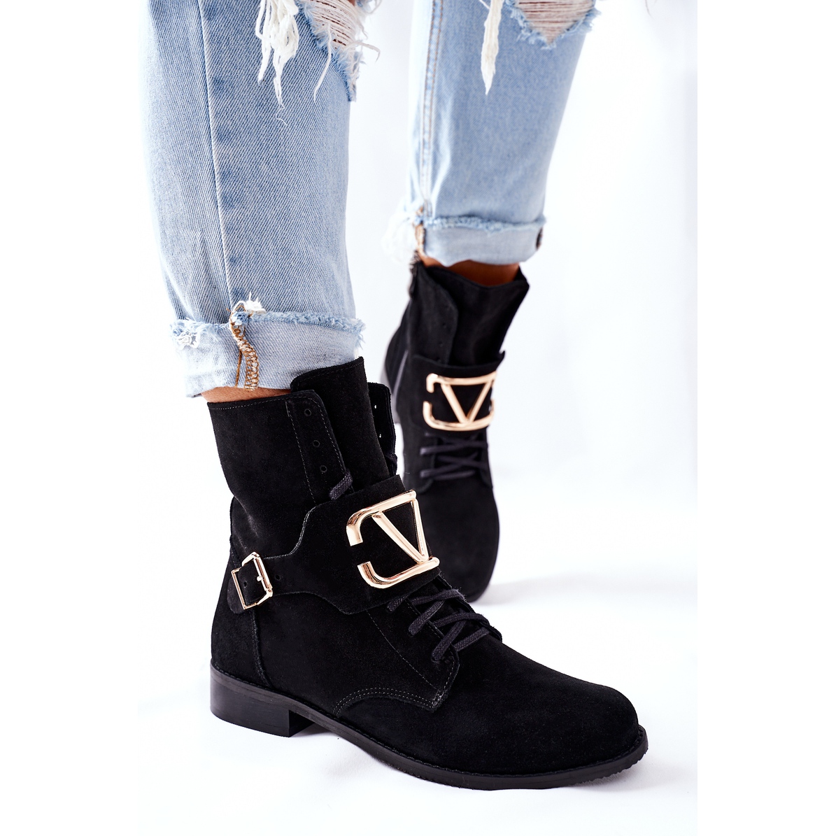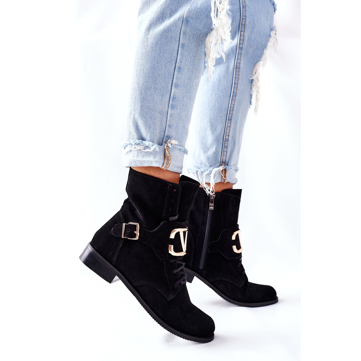 Découvrez un style unique avec les bottines pour femme en daim noir Nicole 2676. Ces chaussures élégantes, en daim naturel, sont le complément parfait à tout style d'automne ou d'hiver. Leurs décorations caractéristiques sous forme d'une grande boucle et de lettres dorées leur confèrent un caractère unique, soulignant votre individualité.