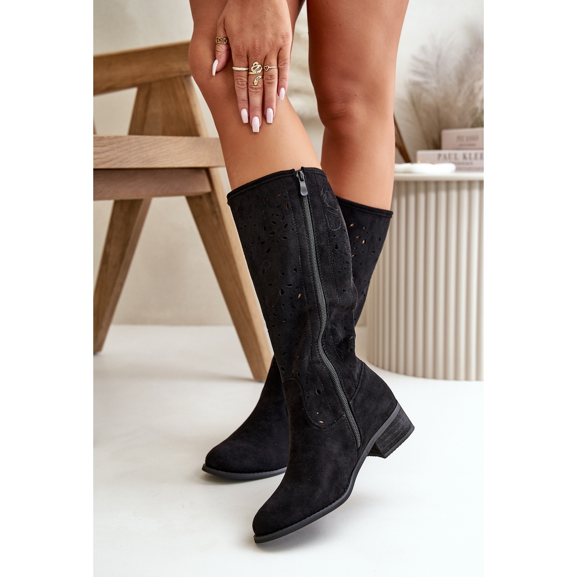 Détails: Bottes Femme Ajourées Sur Talons Bas En Daim Eco Fermeture Zippée Orchidées Noires le noir