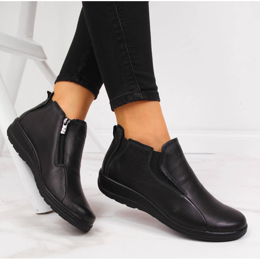 La tige jusqu'à la cheville, d'une hauteur d'environ 9 cm, et la semelle de 1,5 cm d'épaisseur assurent stabilité et protection contre les inégalités du sol. Une cale de 3,5 cm de hauteur est une solution idéale pour les femmes qui recherchent une hauteur accrue, mais ne veulent pas renoncer au confort des chaussures plates. La fermeture éclair permet d'enfiler facilement les chaussures et de les enlever rapidement.