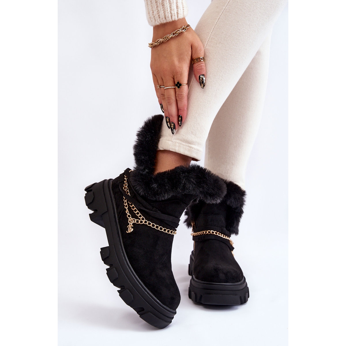 Les bottes sont fermées par une fermeture éclair sur le côté, ce qui les rend faciles à enfiler et à enlever. Isolés avec de la fourrure, partiellement au niveau des pieds, ils garantissent chaleur et confort même les jours les plus froids. Montés sur un talon plat et une plateforme massive à rainures, ils assurent stabilité et confort de port. La hauteur de la plateforme est de 4 cm et le talon de 5 cm, ce qui rend le modèle parfait pour les longues promenades ou les sorties quotidiennes.
