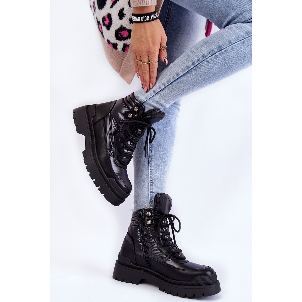 Des bottes élégantes et pratiques créées pour des jours plus froids. La partie extérieure est faite de tissu de haute qualité et de cuir écologique, l'intérieur isolé avec une fourrure douce offre du confort et de la chaleur. Le laçage solide a été complété par un château latéral pour la commodité de mettre. Se méprisait dans un talon plat avec une plate-forme de bande de roulement claire - idéal pour les styles urbains pour l'automne et l'hiver.