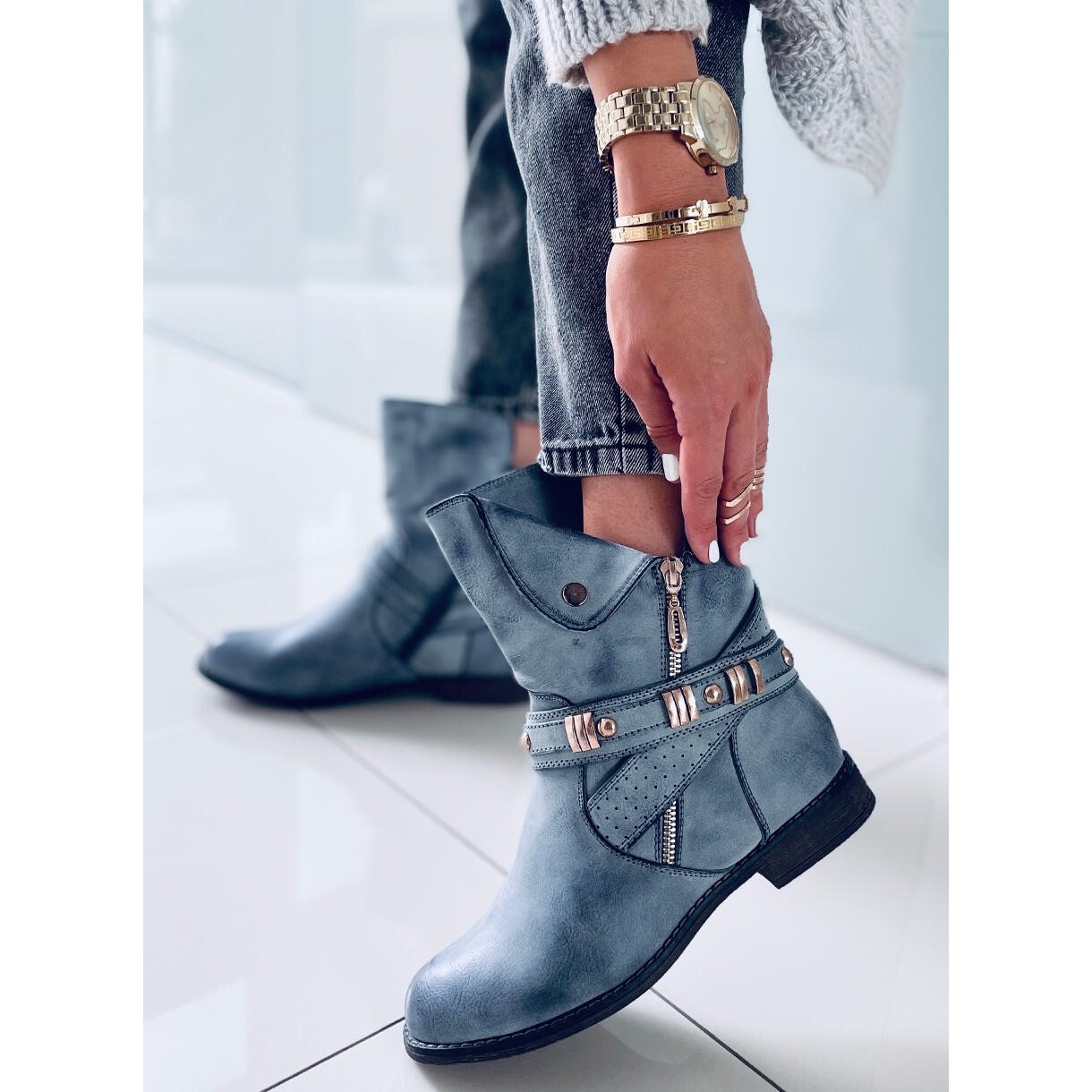 La tige large et les bretelles tendance avec boucles dorées leur confèrent un caractère unique qui attirera certainement l'attention. Grâce à la fermeture éclair pratique, enfiler et enlever les bottes est extrêmement simple et pratique.
