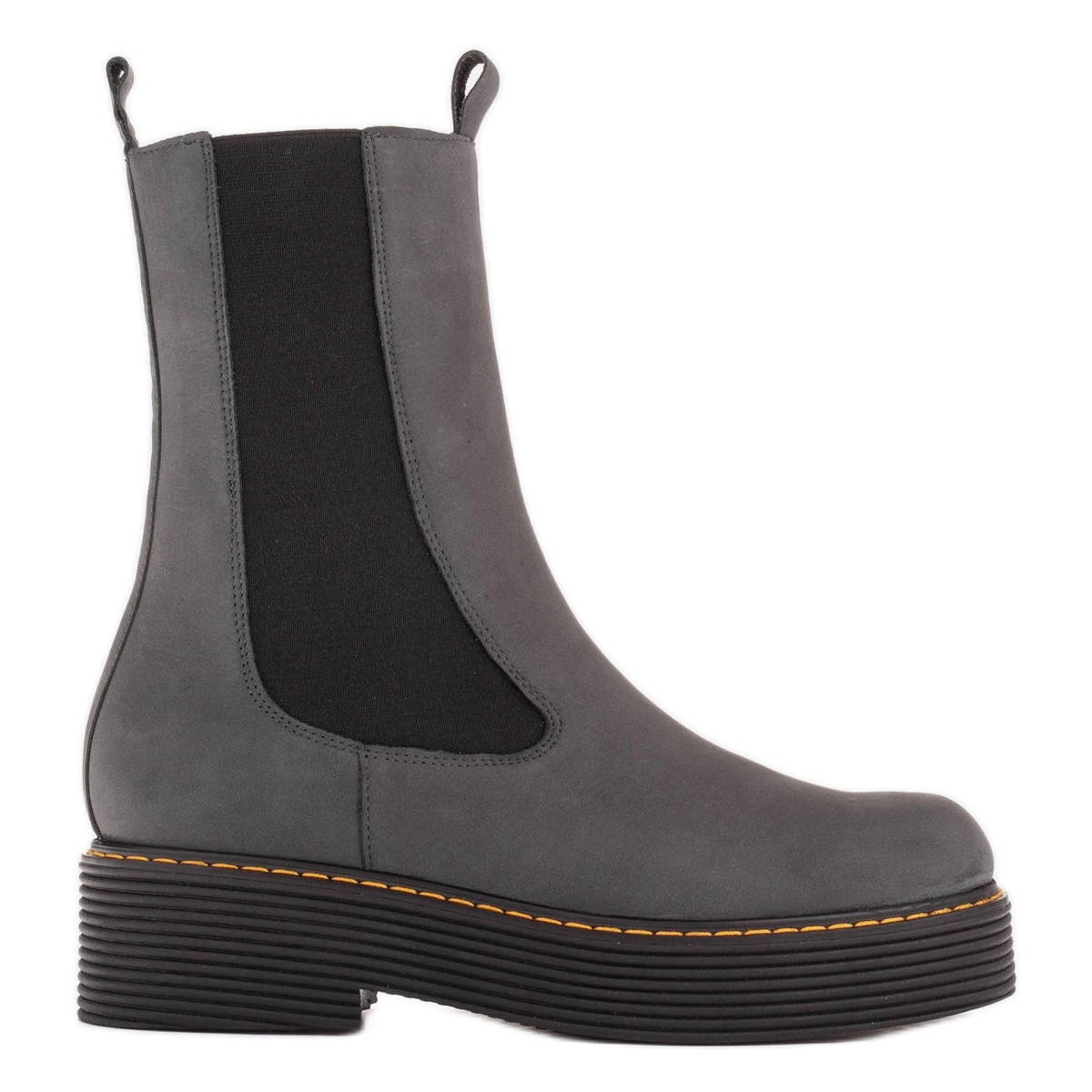 Bottes Greta Marco Shoes élégantes et confortables dans une couleur gris universelle. Fabriqué en cuir en cuir, avec un insert isolant en feutre - parfait pour les jours plus frais. La structure insérée avec du caoutchouc flexible assure une usure rapide et un confort de l'usure, tandis que la plate-forme donne un aspect à la mode et une stabilité.