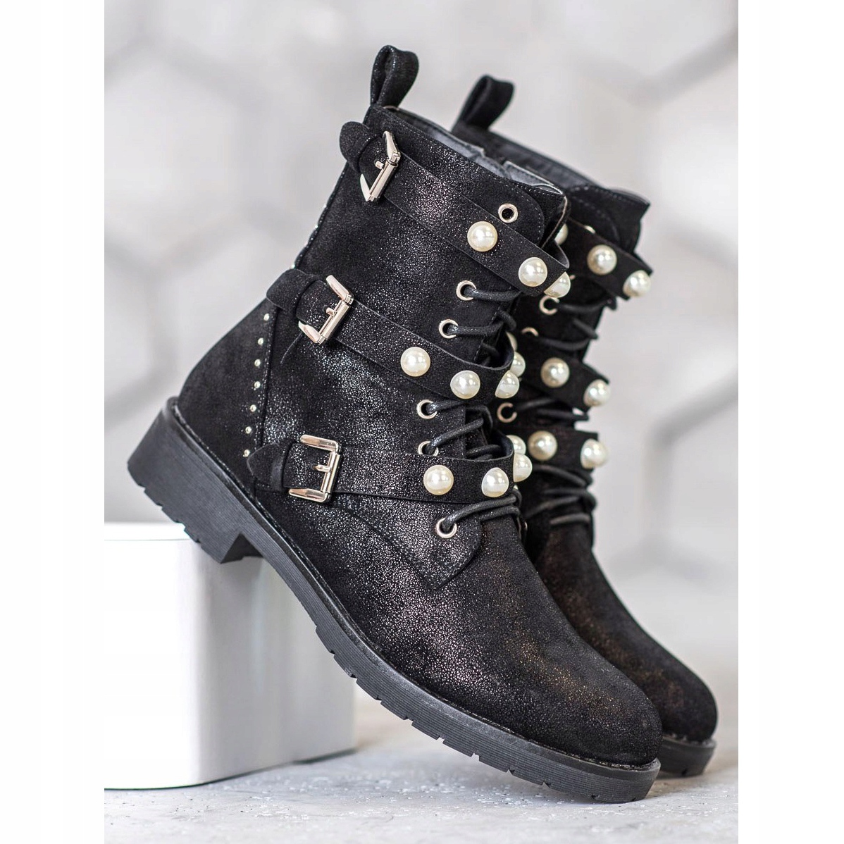 Ces bottes élégantes sont dotées d'un laçage sur le devant et d'une fermeture éclair pratique sur le côté, ce qui les rend faciles à enfiler et à enlever. De plus, leur aspect original est souligné par des ceintures à boucles ornées de perles et de petits strass brillants, qui leur confèrent un caractère rock.