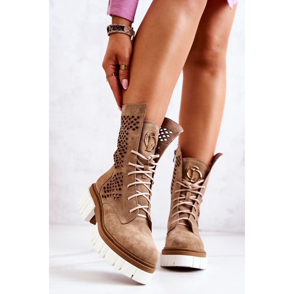 Les travailleurs élégants et pratiques de Nicole entièrement en cuir en daim naturel. La finition ouverte leur donne la légèreté et le caractère universel, grâce à laquelle ils correspondront parfaitement à la fois avec des stylisations quotidiennes et plus élégantes. La semelle massive et blanche avec la plate-forme isole d'un sol froid, et l'insert en cuir naturel garantit le confort.