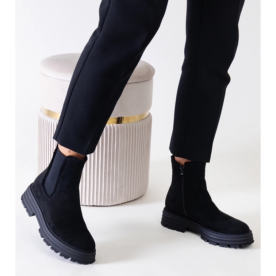Des bottes hautes noires sur une épaisse plate-forme Eco-Zamsz Sabra sont une proposition idéale pour les femmes qui veulent combiner le style et le confort. L'intérieur isolé fournit de la chaleur les jours froids, et les performances du cuir écologique de haute qualité dans une finition en daim leur donne un look élégant.