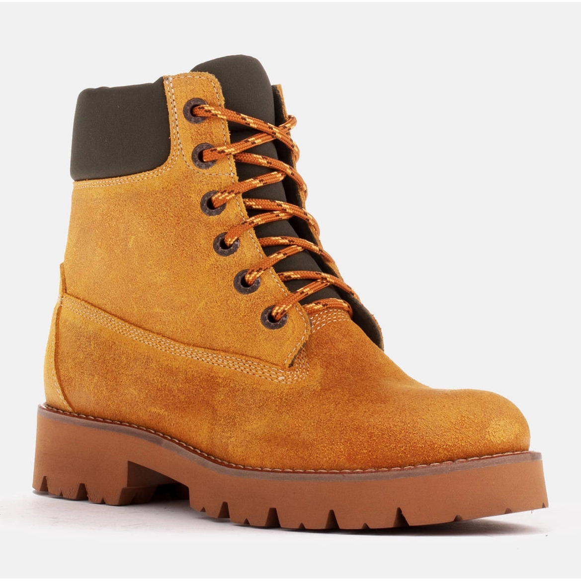 Ces bottes pour femmes de Marco Shoes font partie de la collection KeeShoes. Ils sont fabriqués en cuir de chamois naturel jaune de haute qualité, qui a été spécialement imprégné, ce qui les rend imperméables. Parfait pour le trekking et les aventures en plein air.