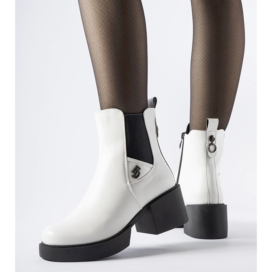 Le produit décrit est des bottines blanches isolées pour femmes avec un bloc massif. Les chaussures sont impressionnantes avec une hauteur de 21 cm et une hauteur de talon de 6,5 cm, ce qui leur ajoute de l'élégance tout en assurant un confort tout au long de la journée. Ils sont disponibles dans une numérotation standard conforme aux normes de l'industrie.