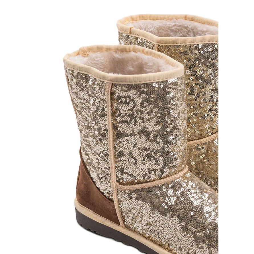 Les bottines isolées dorées type EMU 889 sont le choix parfait pour les femmes qui recherchent une combinaison de style et de confort lors des journées glaciales. Leur design unique attire l'attention grâce à des paillettes dorées claires qui confèrent aux chaussures un caractère élégant et unique. L'intérieur des bottes est doublé d'une fourrure beige chaude, qui garantit une excellente isolation thermique et un confort de port.