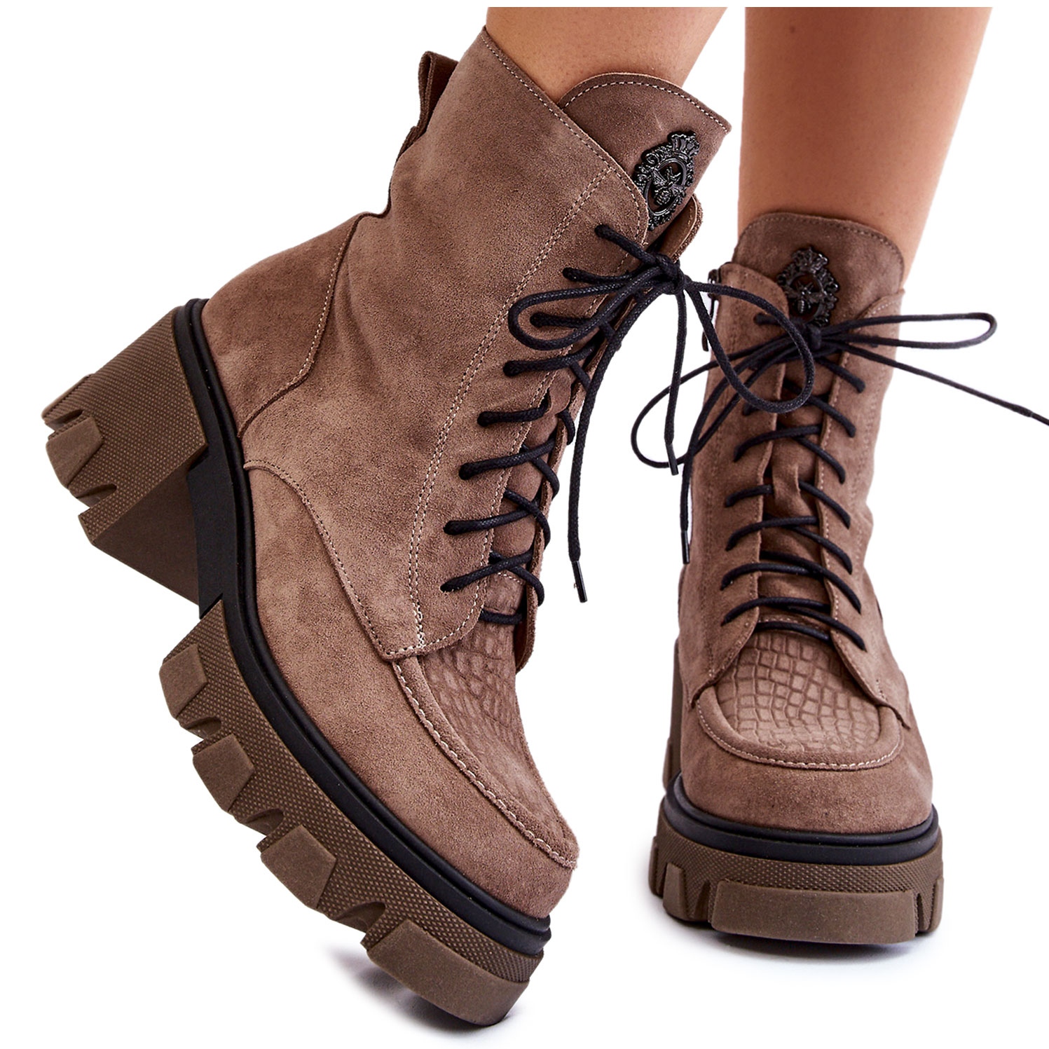Fabriquées en cuir suédé naturel de haute qualité, les bottes allient élégance et praticité. Un laçage classique et une fermeture éclair supplémentaire située sur le côté de la tige assurent un enfilage et un réglage faciles. Le talon raidi offre stabilité et protection supplémentaire, et le bout rond ajoute de la légèreté et un caractère féminin.