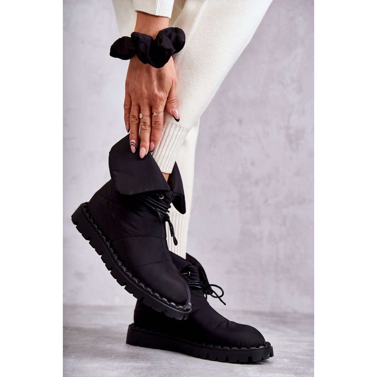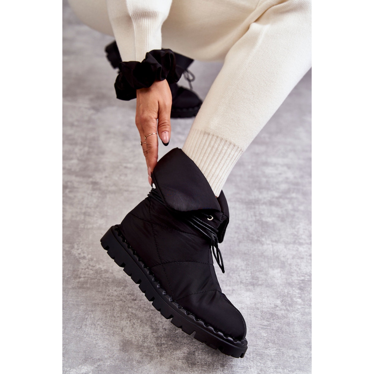 Les bottes sont équipées de laçage, ce qui non seulement leur ajoute du charme, mais permet également un ajustement parfait au pied. Leur plateforme antidérapante avec rainures en caoutchouc assure la sécurité même dans les conditions météorologiques les plus difficiles. La hauteur de la semelle est de 3 cm, ce qui offre un confort supplémentaire lors d'un port prolongé.