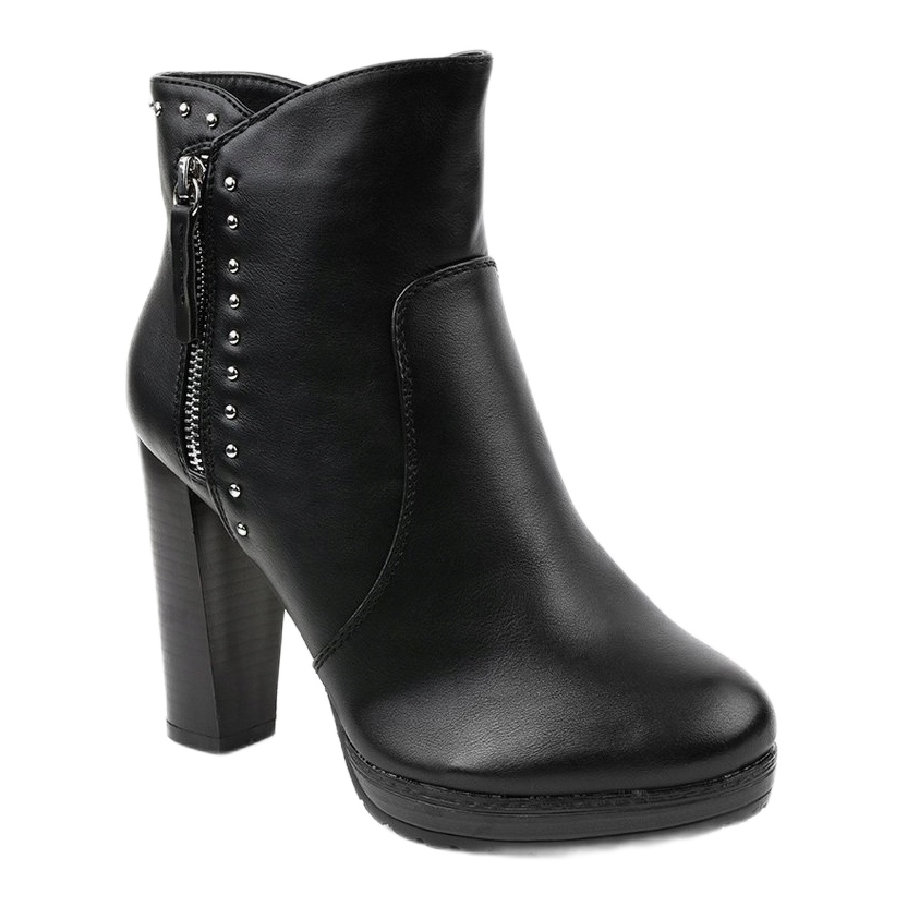 La tige en cuir écologique de haute qualité de couleur noire classique est extrêmement élégante. Un avantage supplémentaire réside dans les fermetures éclair sur les côtés, qui non seulement facilitent l'enfilage, mais donnent également aux chaussures un caractère moderne. À leur tour, les clous argentés placés sur le côté constituent un accent parfait qui met en valeur le design unique.
