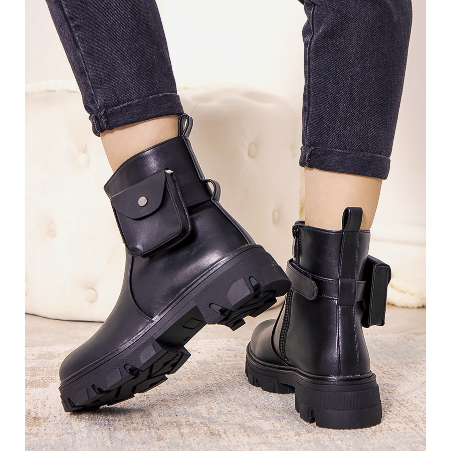 Les bottines isolées noires avec un sac Millikin sont un véritable succès qui attirera certainement l'attention de tous les amateurs de solutions à la mode et pratiques. Fabriquées en cuir écologique, ces bottines sont non seulement élégantes, mais sont également respectueuses de l'environnement. Une pochette décorative fixée sur la bride autour de la cheville leur confère un caractère militaire, et sa présence peut être facilement modifiée selon votre humeur en la retirant lorsque vous souhaitez donner un look plus décontracté aux chaussures.