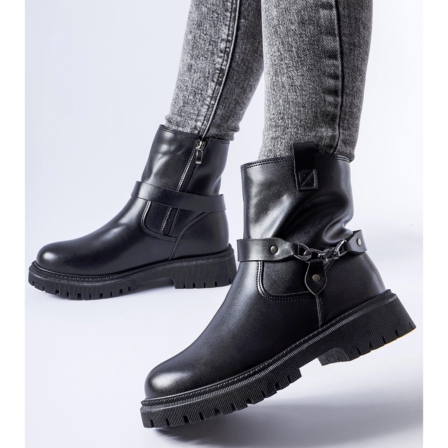 Les bottines noires isolées avec chaîne sont des chaussures pour femmes élégantes et fonctionnelles, spécialement dédiées aux mois froids. Le modèle présenté est constitué de bottes confortables et chaudes conçues pour les femmes qui apprécient une combinaison d'apparence à la mode et de confort d'utilisation.