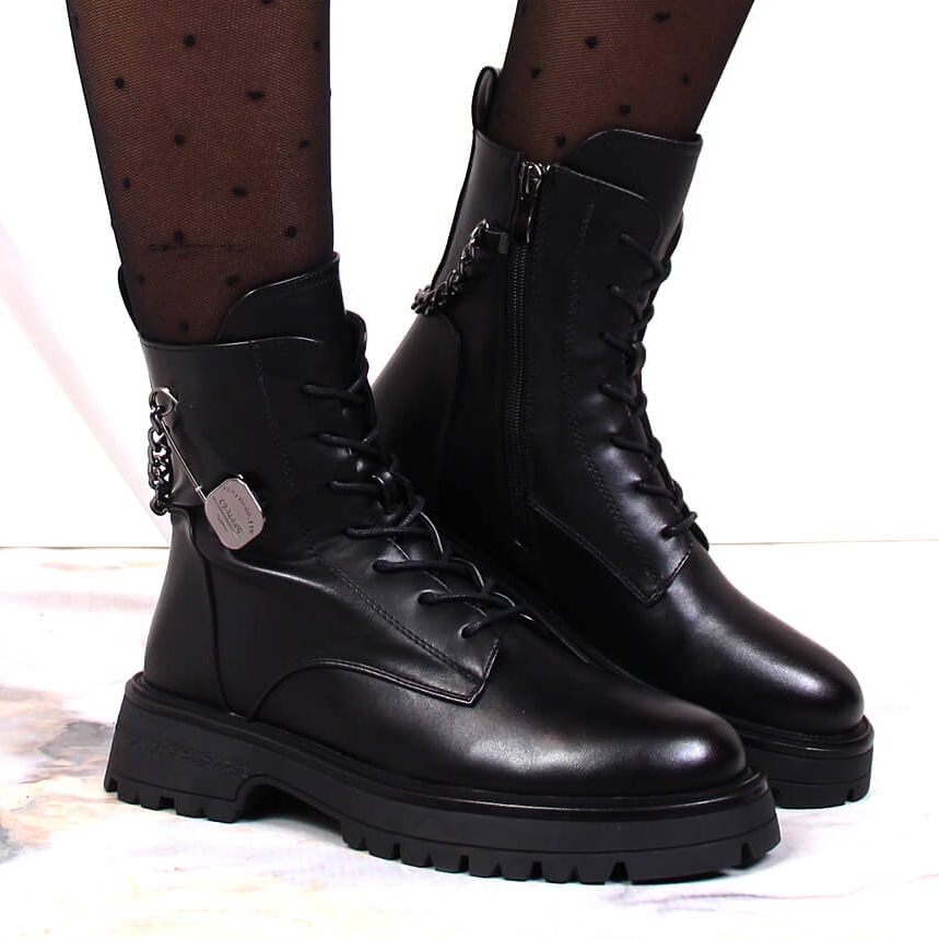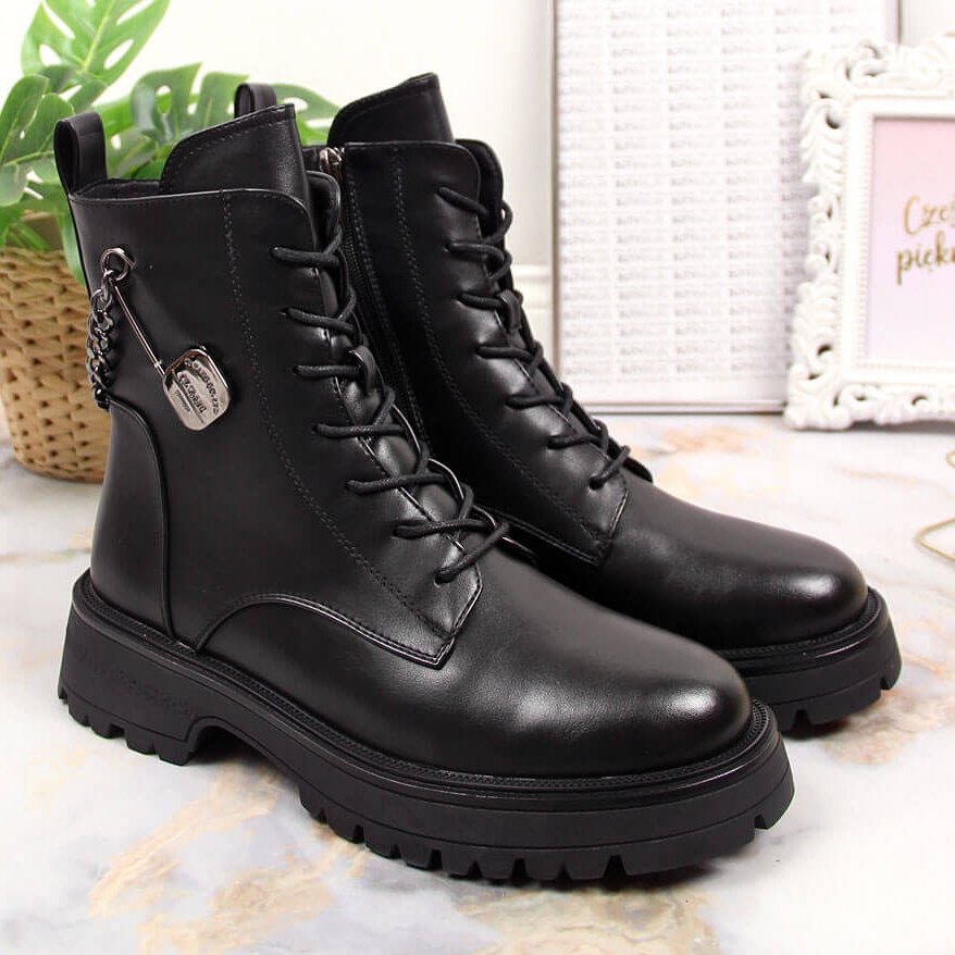 La hauteur supérieure d'environ 15 cm et le bout rond confèrent aux chaussures un look classique et moderne. Des détails comme une chaîne soulignent leur caractère unique et ajoutent une touche chic. Grâce à la fermeture éclair et au laçage, les bottes s'adapteront parfaitement à tous les pieds, et la taille standard vous permet de choisir librement la bonne taille.