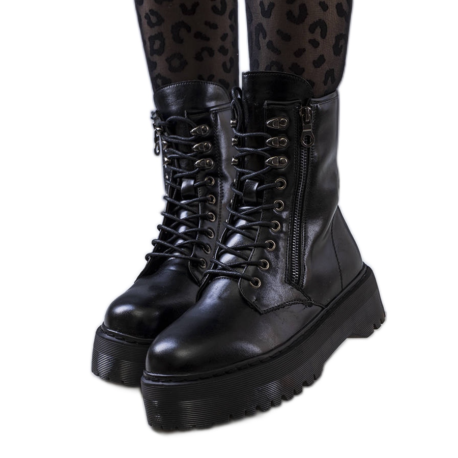 Les trappeurs noirs isola sont un incontournable la saison automne / hiver. Fabriqué en cuir écologique, avec un intérieur isolé fini avec une fourrure douce, fournira de la chaleur et du confort même à des températures plus basses. La plate-forme Trapper caractéristique et haute ajoute une expression à la mode et une stabilité de toute stylisation.