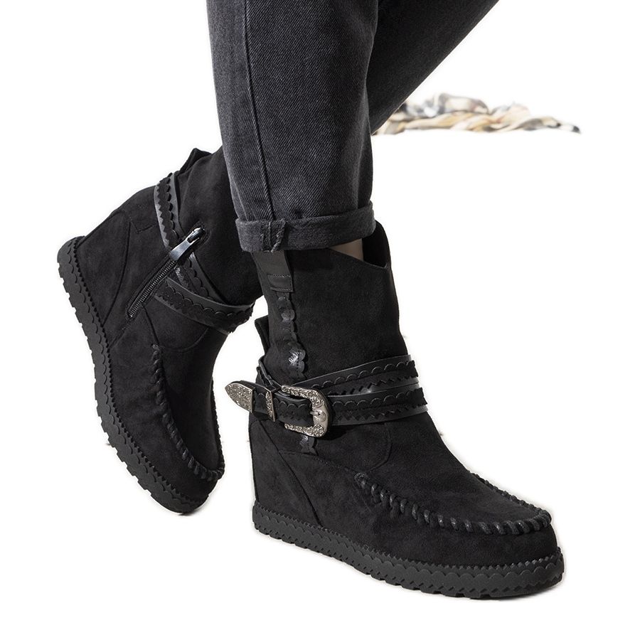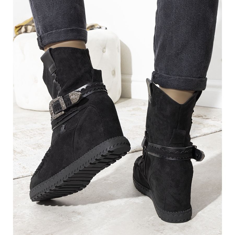 Bottes isolées Boho Hanson pour femmes noires - Élégant, confortable et prêt pour des jours plus frais. Le modèle en cuir écologique en daim en noir profond s'intègre parfaitement dans les stylisations d'automne et d'hiver. Les coutures épaisses de la tige et une sangle décorative autour de la cheville donnent le caractère. L'intérieur isolé avec une couverture de chaussures souples assure le confort et la chaleur même à basse température. Un backet de 7 cm de haut modélise subtilement la silhouette, et la semelle en caoutchouc garantit une bonne adhérence.
