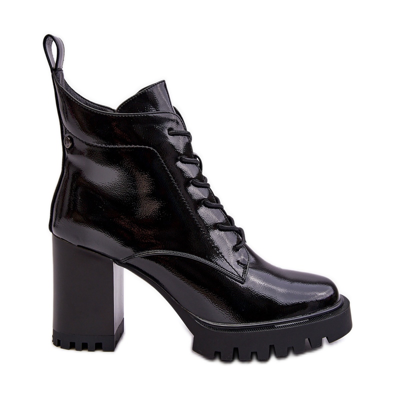 S. Barski a fait vibrer des bottes sur le pilier isolées - chaussures noires, élégantes et pratiques pour la saison automne / hiver. Fabriqué en cuir écologique verni, réglé sur un talon de barre stable (8,5 cm), assurez une certaine étape et un look féminin. L'intérieur est bordé d'une couverture de réchauffement, grâce à laquelle les chaussures fonctionneront les jours plus frais.