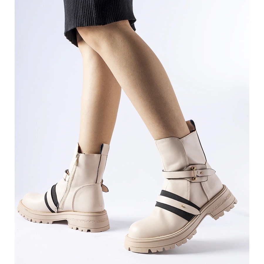 Ces bottes isolées beiges sont des chaussures d'hiver tendance et fonctionnelles pour femmes. Fabriquées en éco-cuir, ces bottines ont un bout rond qui ajoute élégance et style. Leur construction haute, arrivant au-dessus de la cheville, offre un excellent maintien et une excellente protection contre le froid.