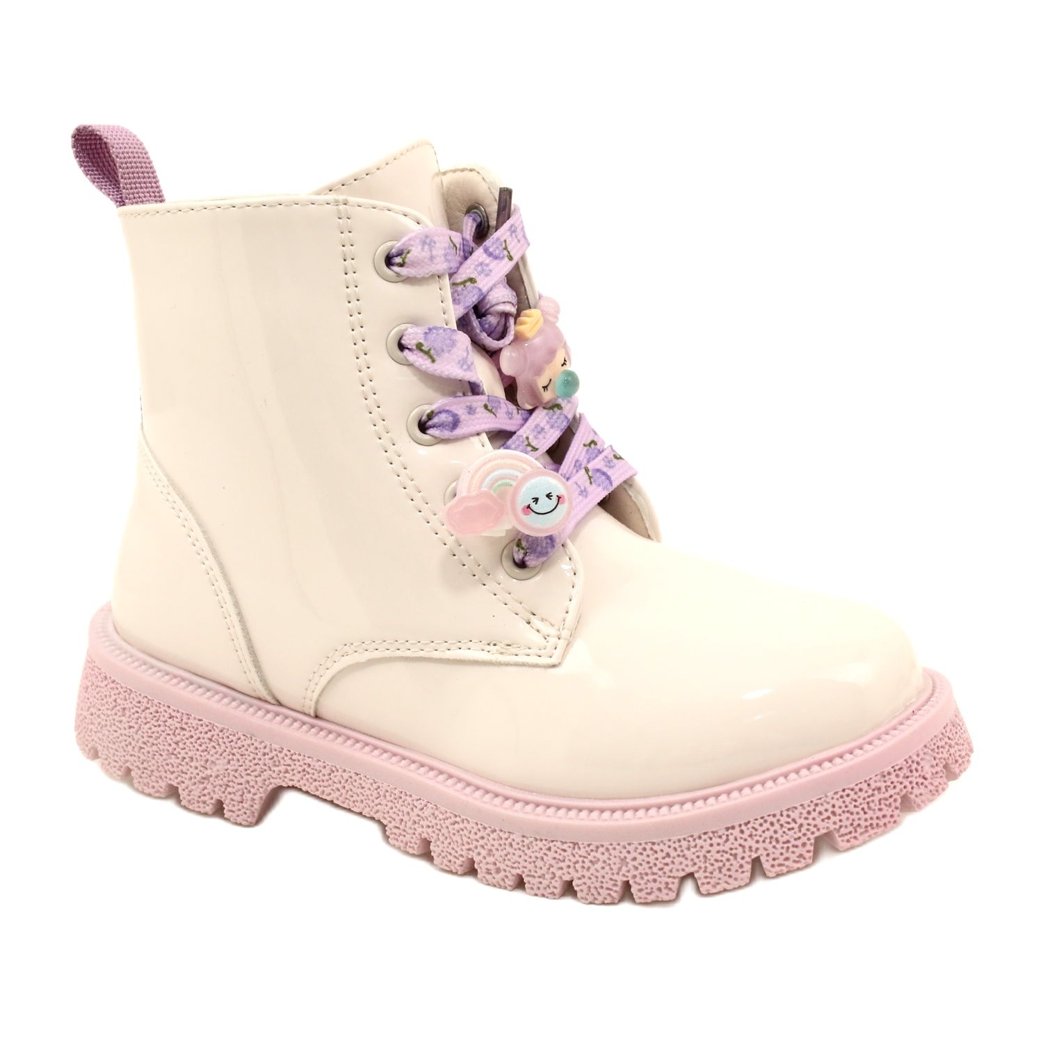 Des bottes élégantes en cuir écologique de haute qualité dans une teinte délicate et légère. L'intérieur et insérer isolés avec une fourrure douce, qui offre de la chaleur et du confort les jours plus frais. Le personnage est ajouté par des boutons de manchette décoratifs "cliquer" attachés aux lacets - un accent subtil et très jeune. La semelle rose du thermocoat combine une apparence à la mode avec force.