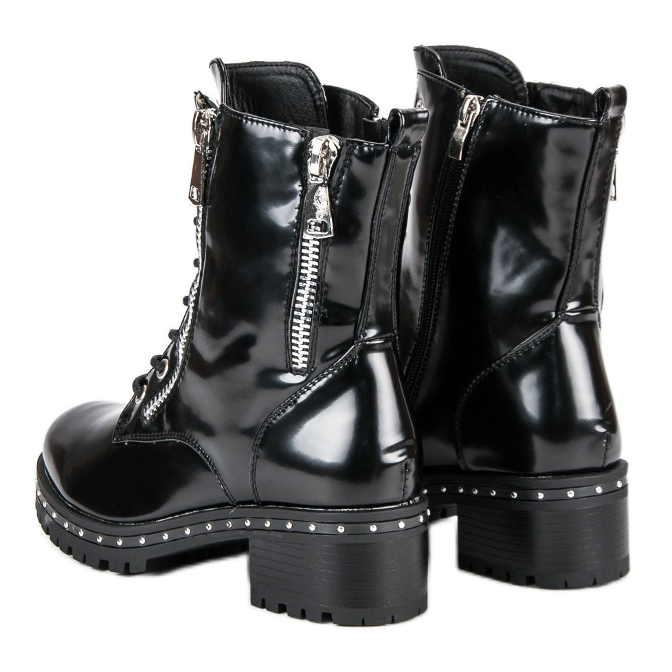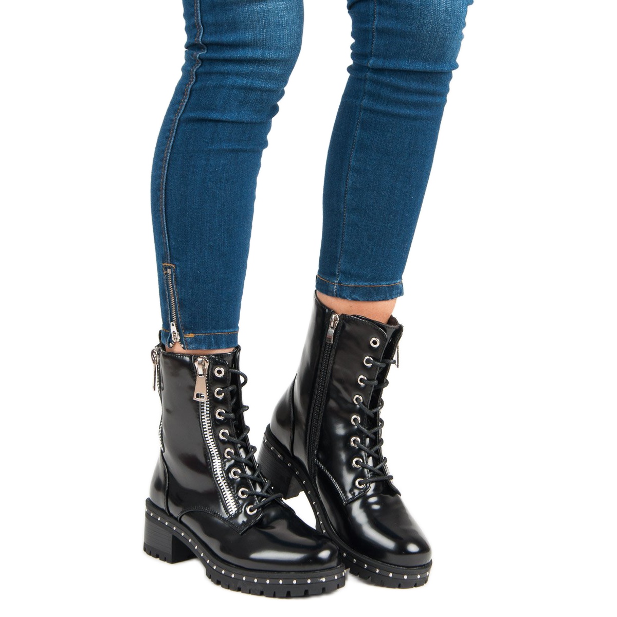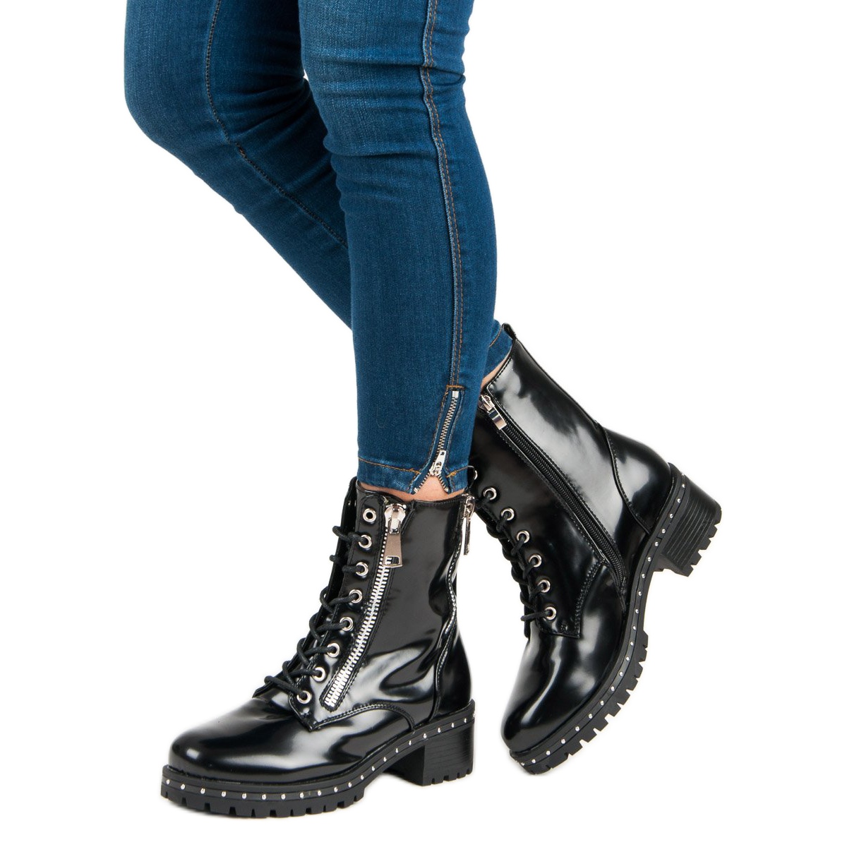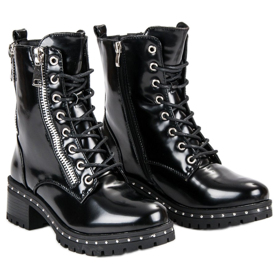 Ces bottines pour femme allient fonctionnalité et tendances actuelles. Grâce à un laçage pratique et à des fermetures éclair supplémentaires, ils peuvent être enfilés et retirés rapidement et facilement. Les détails, tels que les strass sur la tige, leur donnent un avantage et en font un choix idéal pour les femmes courageuses qui apprécient l'originalité.