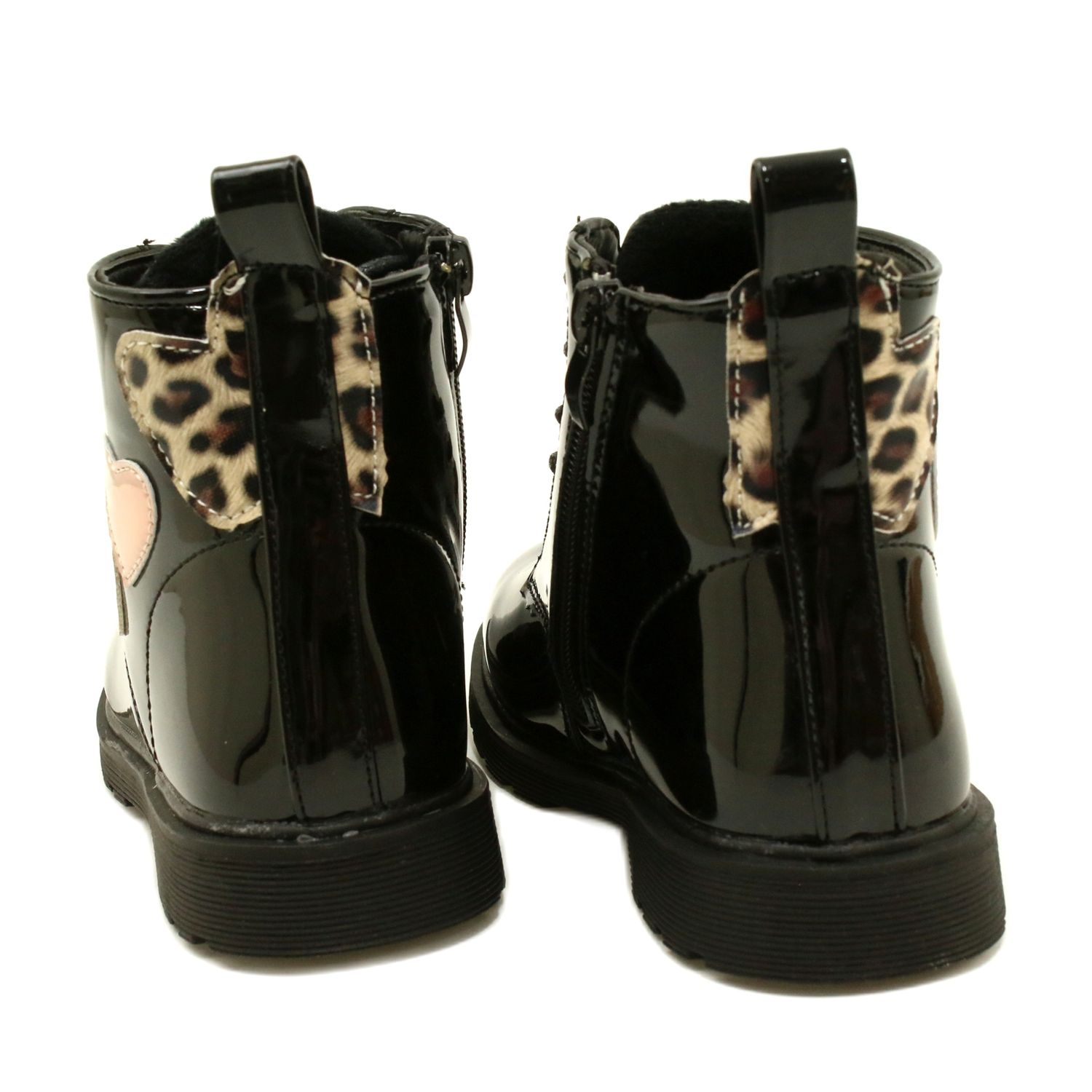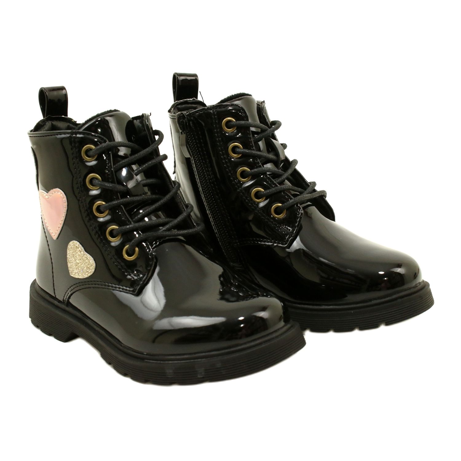 Des bottes miss élégantes en cuir écologique verni en noir classique. L'intérieur et insérer isolés avec une fourrure de chaussures molle, grâce à laquelle les chaussures offrent du confort et de la chaleur les jours plus frais. Les cœurs décoratifs sur la tige extérieure en accent doré leur donnent un caractère fille et l'originalité.