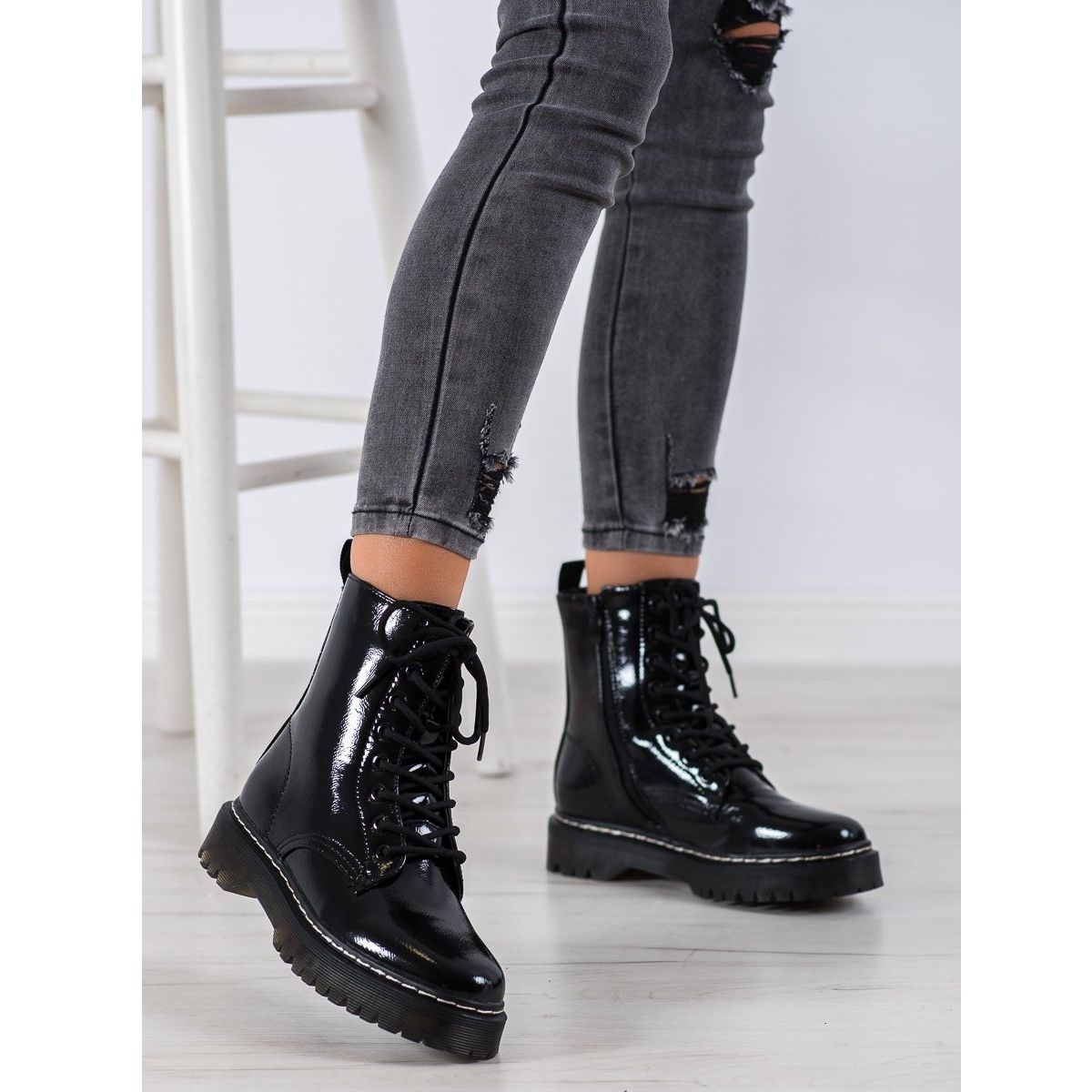 Les bottes Bovver laquées SHELOVET ont une hauteur supérieure de 17-18 cm et une plateforme de 2 cm, ce qui leur donne un charme supplémentaire et met en valeur les jambes. La semelle crantée offre une bonne adhérence, ce qui les rend adaptées à un usage quotidien, aussi bien en milieu urbain que lors de promenades.