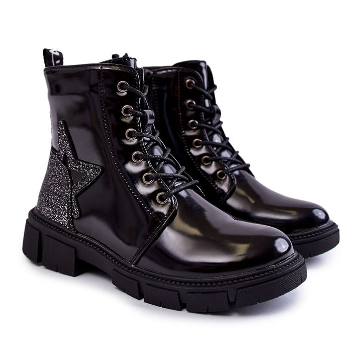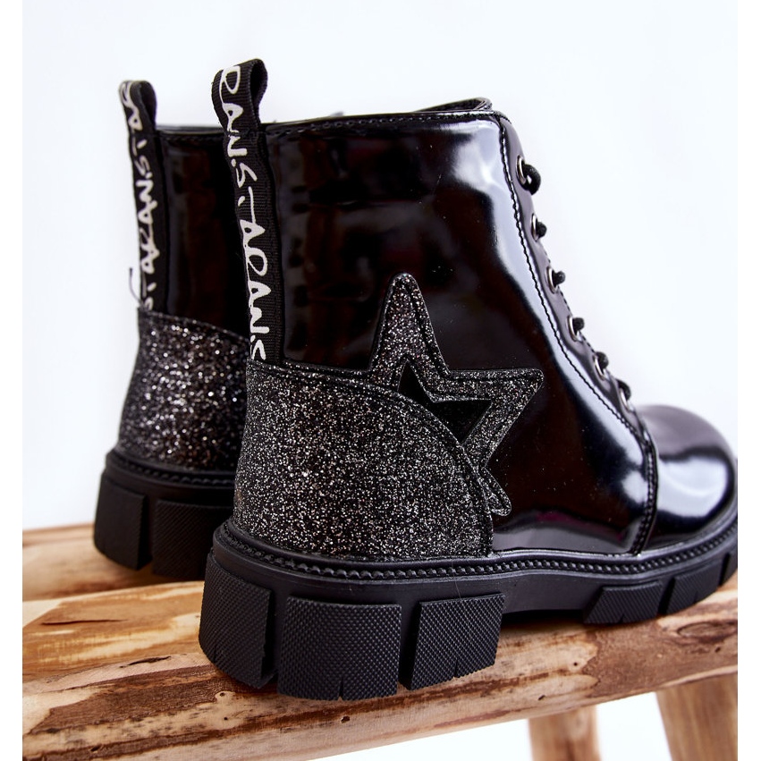 Le modèle de bottines noires se distingue par un laçage classique et une fermeture éclair pratique sur le côté de la tige, qui permet de l'enfiler et de l'enlever facilement. Une décoration pailletée supplémentaire sur le côté ajoute du charme et permet à chaque fille de se sentir spéciale.