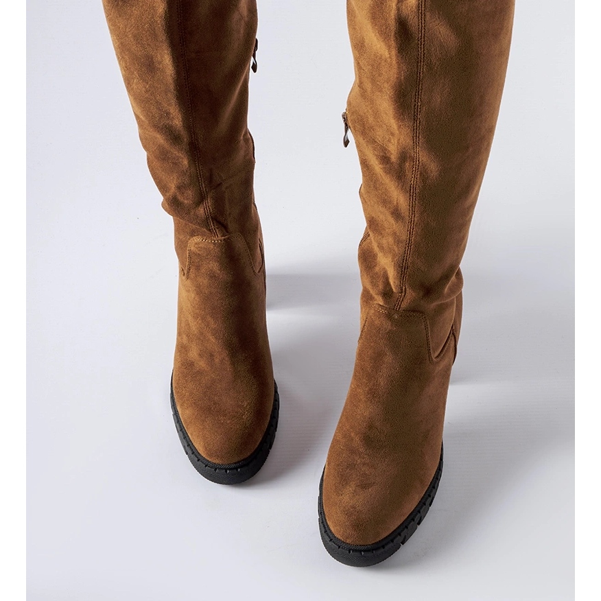 Bottes de genou de chameau élégantes en cuir en daim écologique. La coupe classique et intemporelle avec un orteil rond et une barre massive avec 9,5 cm de haut assure la stabilité et le confort lors de la marche. L'intérieur isolé et l'insertion de tissu garantissent un confort thermique les jours plus frais, et la structure insérée additionnée d'un château latéral le rend plus facile à mettre et à décoller.