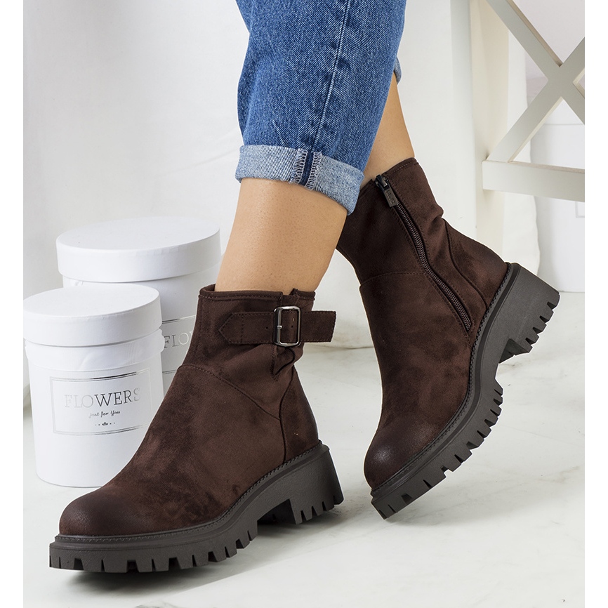 Aleandra Brown Boots - Doit avoir cette saison. Élégant, universel et confortable - parfait pour des jours plus frais. Une plate-forme élevée de 4 cm et une semelle en caoutchouc isolant efficacement du sol, et l'isolation fournira une chaleur agréable. Le haut en cuir écologique en daim de haute qualité s'occupe du confort et ajoute une finition mate élégante.