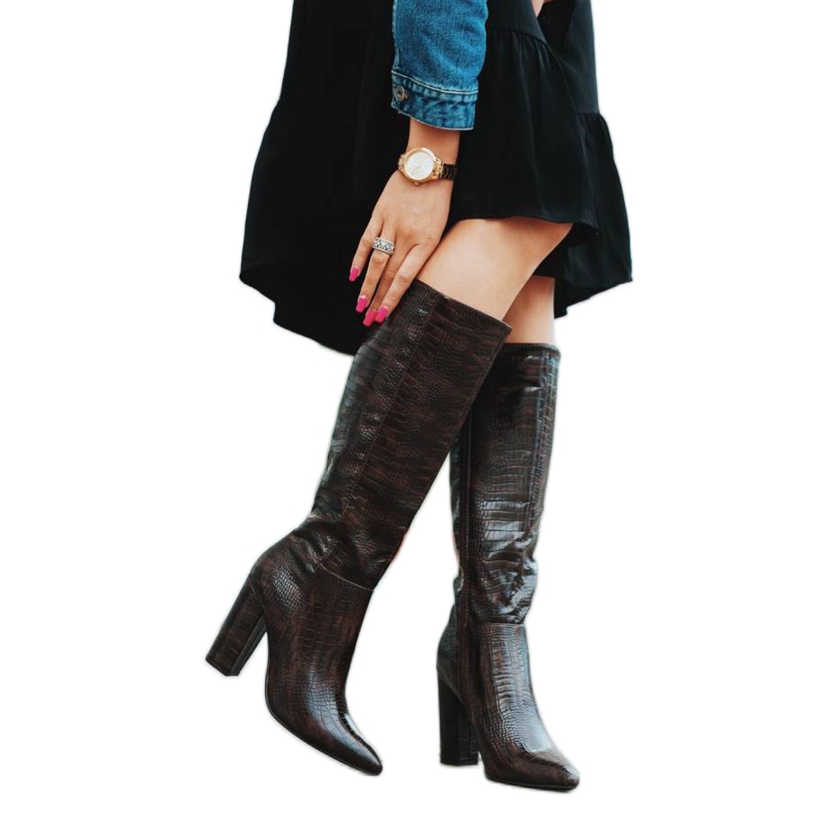 Nous vous présentons les bottes à talons hauts Phoebo marron - le choix parfait pour la saison hivernale, qui mettront en valeur votre style élégant. Ces bottes marron foncé sont fabriquées dans une matière semblable au cuir et leur étonnant motif crocodile leur confère une originalité et un caractère unique.