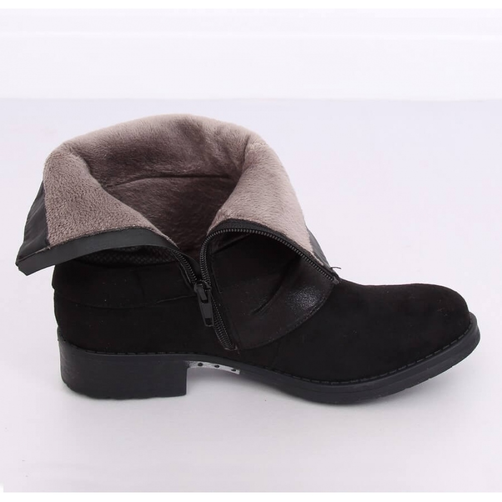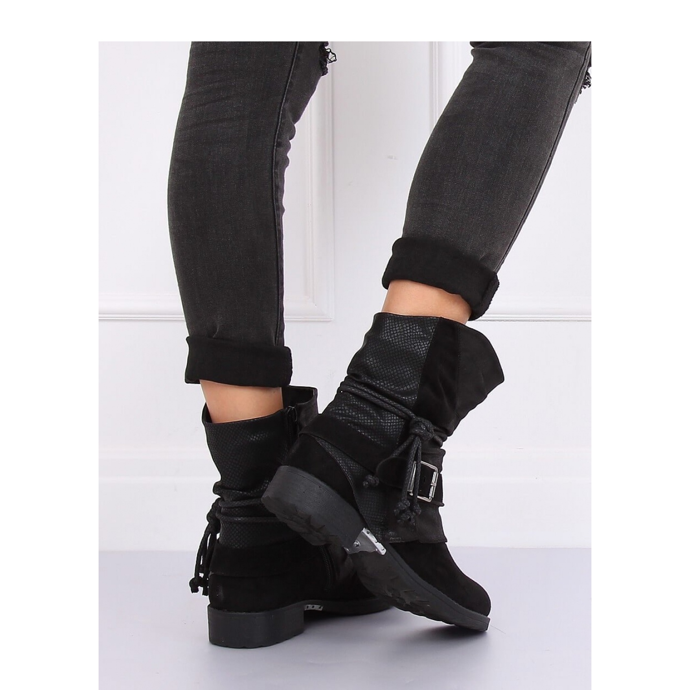 Bottines pour femme de style militaire. Le modèle se distingue par un col froncé tendance avec une boucle et des accessoires accrocheurs ? inserts à la texture peau de serpent et subtilement chatoyants. Ils attireront certainement l'attention. Une fermeture éclair latérale pratique permet de l'enfiler facilement. L'intérieur des chaussures est doublé d'une fourrure délicate. Matériau extérieur ? daim écologique + cuir écologique.
