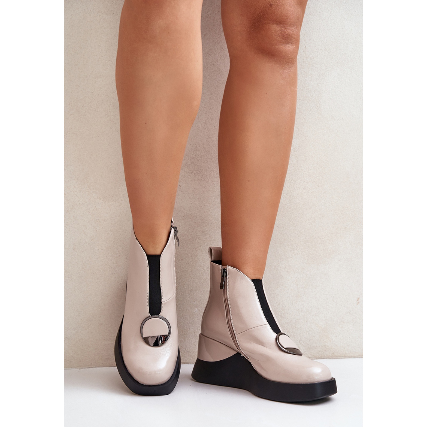 Les détails caractéristiques, tels que la fixation sur le côté et un insert flexible à l'avant, leur donnent non seulement des fonctionnalités, mais aussi un charme unique. Les orteils arrondis mettent l'accent sur le style délicat et féminin, ce qui fait des bottes à combiner avec diverses tenues - du décontracté à plus élégant.