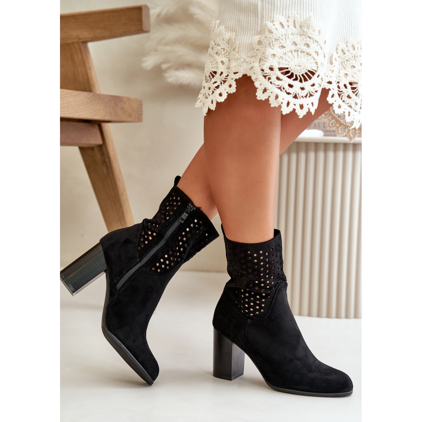 La tige Openwork leur donne un caractère unique, et la fermeture éclair le rend plus facile à mettre et à décoller, tout en garantissant un ajustement parfait au pied. Un talon stable de la hauteur de 8,5 cm de haut souligne l'apparence féminine, tout en assurant le confort de porter même pendant longtemps.