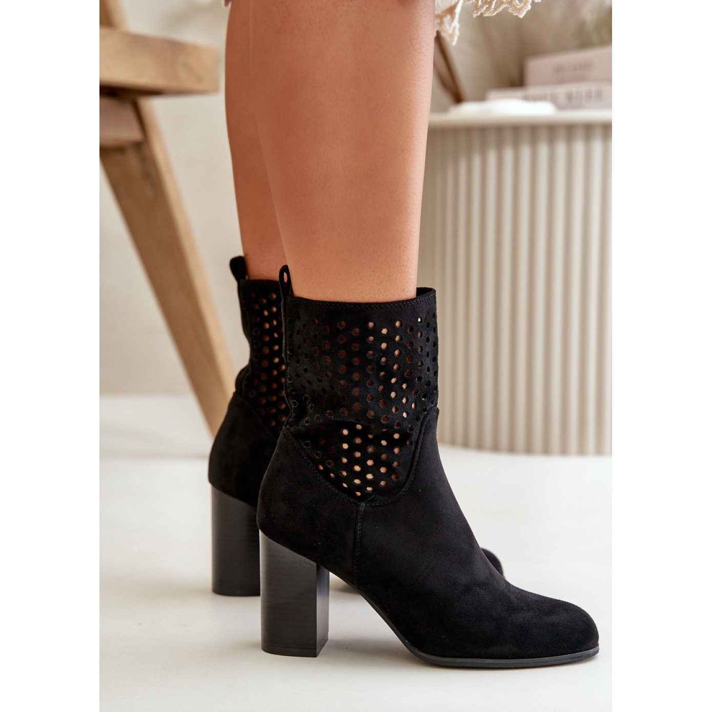 Bottines femme à tige ajourée. Fabriqué en daim écologique. Fermeture éclair, ce qui facilite l'enfilage et le retrait et assure un bon ajustement au pied. Les bottes sont montées sur un talon bloc stable, qui souligne le look féminin, ajoute quelques centimètres de hauteur et assure un confort de port. Ces bottines élégantes se marient bien avec une variété de styles, du plus décontracté au plus élégant, constituant un choix parfait pour toute occasion.