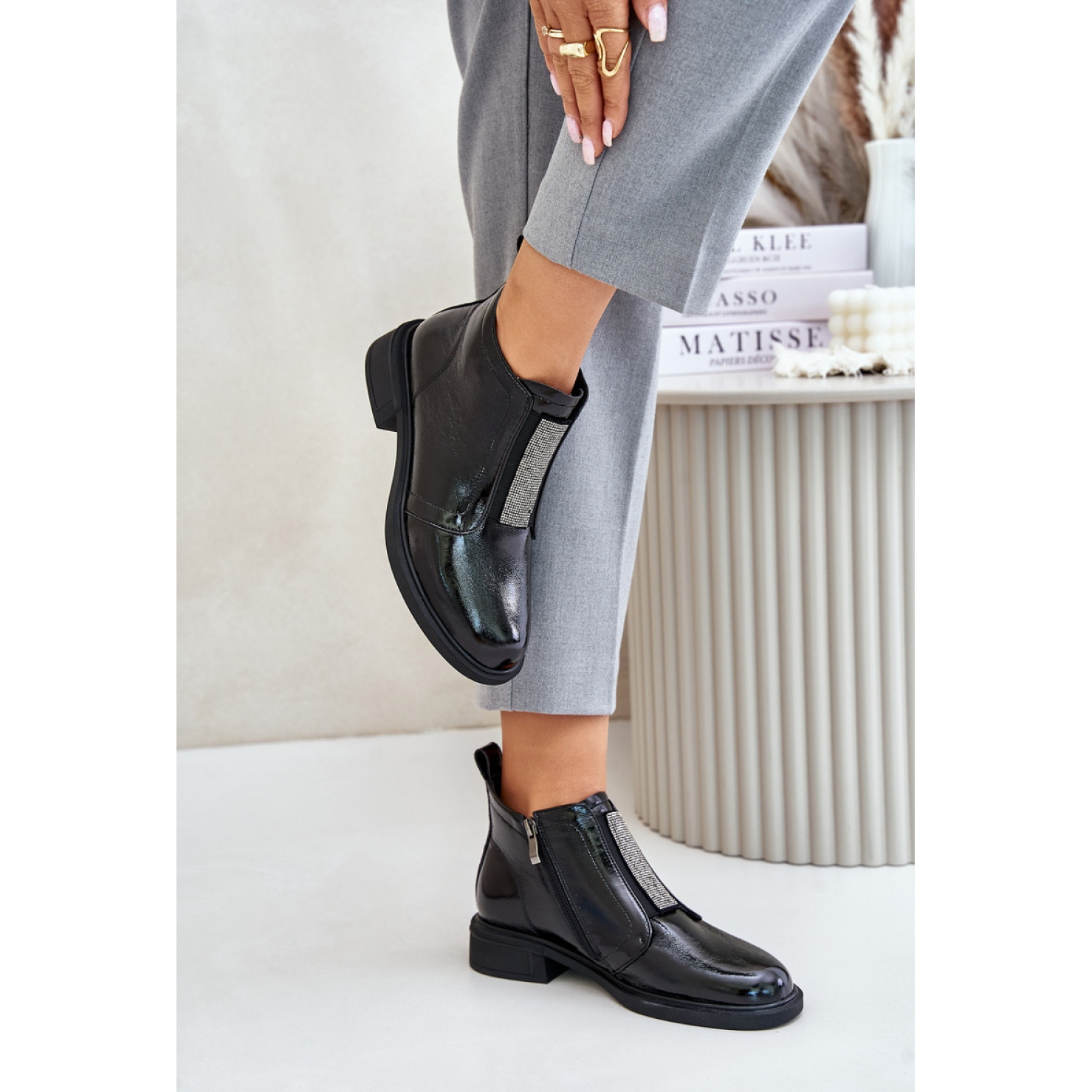 La tige, atteignant la cheville, et un nez arrondie donne aux bottes un caractère classique et universel. Un avantage supplémentaire est les strass subtiles, qui décorent l'avant des chaussures, introduisant un peu d'éclat à chaque stylisation. Les bottes rapides à la fermeture à glissière facilitent la mise en place et le décollage, ce qui est une solution pratique tous les jours.