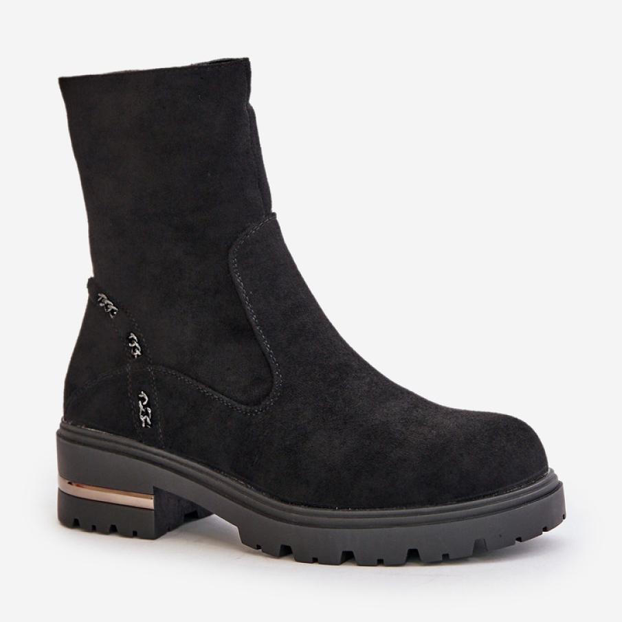 Des bottes plates de 5 cm de haut, avec des orteils arrondies, offrent un confort exceptionnel tout au long de la journée. L'accent caractéristique sous la forme d'une chaîne décorative sur la tige leur donne un personnage moderne et élégant. Grâce à l'isolation de la couverture du réchauffement, les pieds restent chauds même les jours les plus froids, ce qui en fait un excellent choix pour l'automne et l'hiver.
