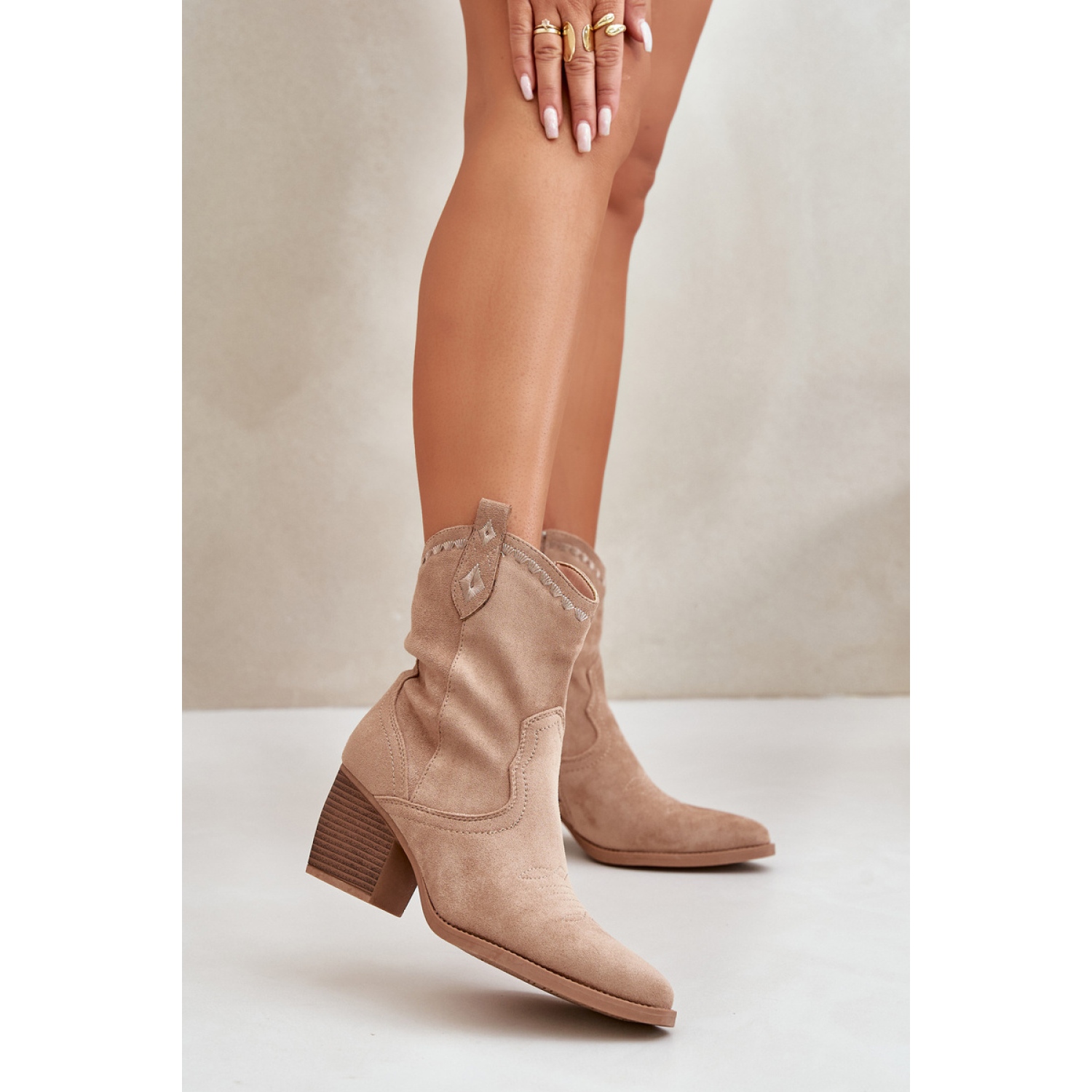 Bottes de cowboy pour femmes. Fabriqué en suède écologique, c'est le choix parfait pour les journées les plus froides. Montés sur un talon bloc stable, ils assurent un confort de port. Les bouts pointus affinent visuellement les jambes, ajoutant de la légèreté à la silhouette. Dessus décoré de surpiqûres. L'intérieur est isolé avec un couvre-chaussures, qui garantit la chaleur, et la fermeture éclair facilite l'enfilage et le retrait des chaussures. Parfait pour le style d’automne.