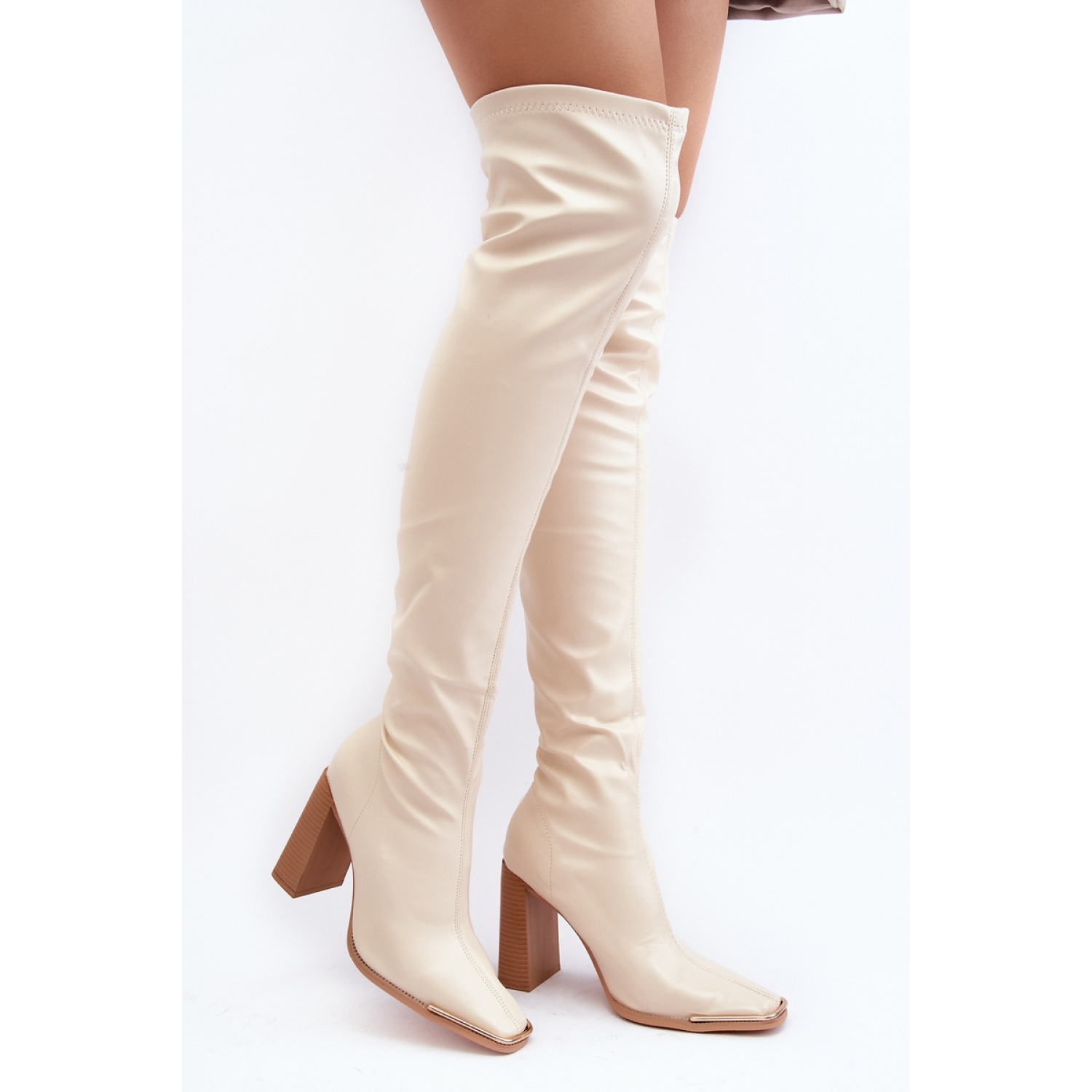 Bottes pour femmes élégantes en cuir écologique. Monté sur un talon en forme de poteau. Bouts carrés. Modèle à enfiler. Tige jusqu'aux genoux décorée de surpiqûres. Parfait pour les robes et jupes. Vous devriez absolument les avoir !