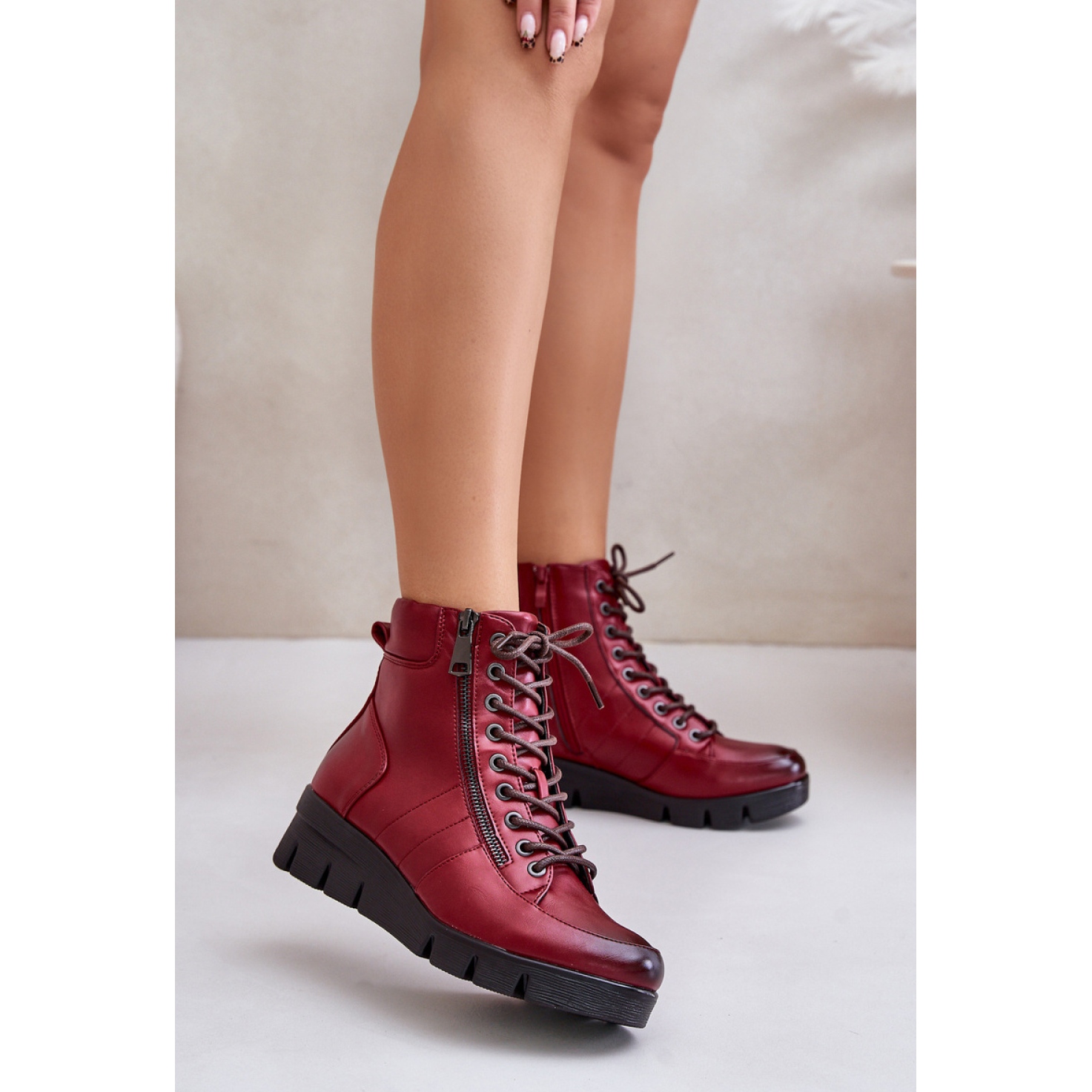 Bottines pour femmes en cuir écologique. Installé sur une plate-forme et une cale. Fermée par une fermeture éclair et lacée, ce qui assure un ajustement parfait au pied. Bouts arrondis. L'intérieur est isolé avec une couverture pour chaussures agréable au toucher. Un modèle extrêmement léger qui complétera parfaitement les looks d'automne et d'hiver !