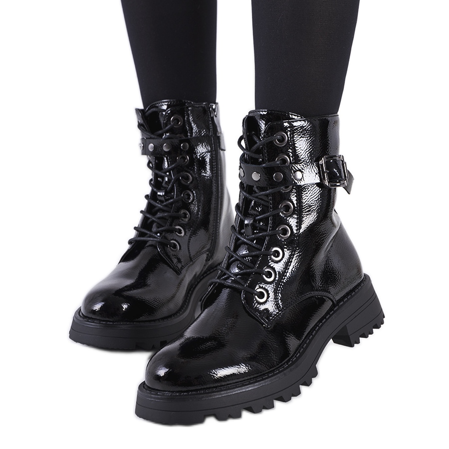 Des trappeurs narnclaeda élégants et noirs combinent un look à la mode et verni avec la praticité des chaussures décontractées. Les bottes atteignent la cheville, ont un nez arrondi et sont intégrées sur une semelle épaisse et protégée (environ 5 cm de haut), ce qui assure une bonne adhérence et une bonne stabilité. La fermeture à glissière placée à l'intérieur le rend plus facile à mettre, et la reliure avant donne la possibilité de correspondre à la tige. Une décoration subtile est une ceinture en argent. L'intérieur est isolé, ce qui en fait le choix parfait pour la saison automne / hiver.