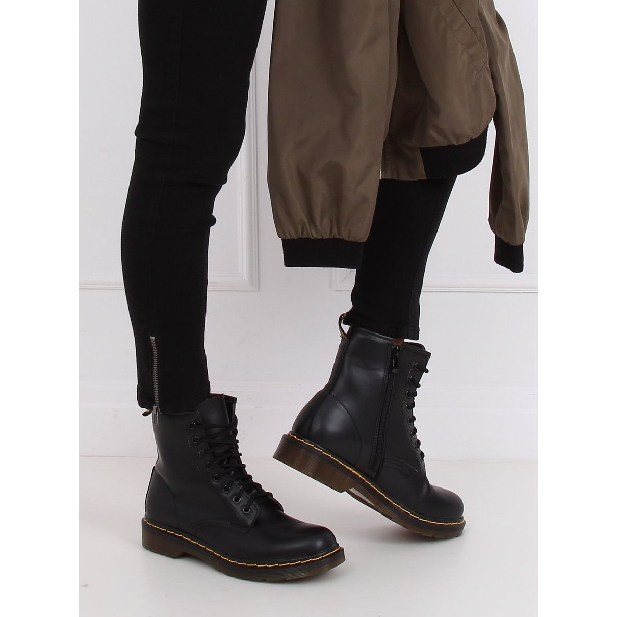 Ces bottines noires arrivent au-dessus de la cheville, ce qui souligne encore davantage leur style militaire. Ils s'adaptent parfaitement aux styles décontractés du quotidien et le talon plat (hauteur 3,0 cm) assure un confort de port tout au long de la journée. Le bout rond ajoute de la légèreté à l'ensemble et rend ces chaussures également universelles pour diverses occasions.