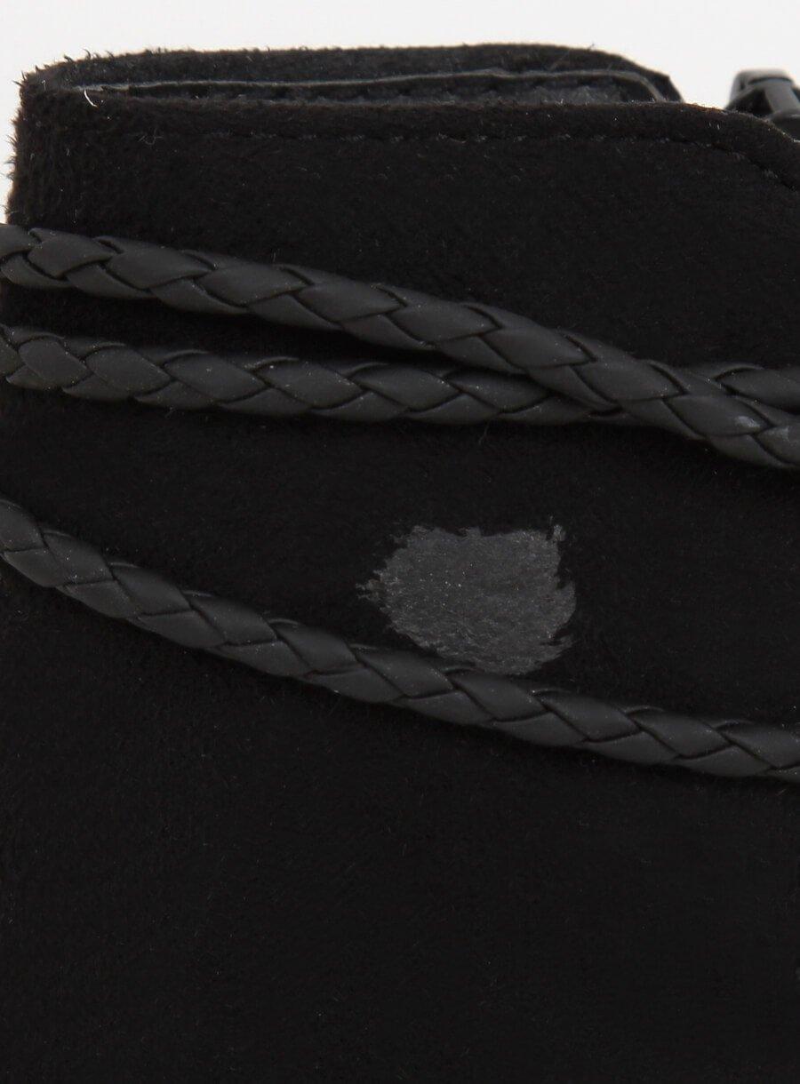 Des bottes élégantes pour femmes noires sur un article stable, idéal pour les stylisations quotidiennes et semi-formelles. La tige en daim écologique est décorée de sangles à franges, qui enveloppent efficacement le cube. L'intérieur est bordé de fourrure douce, ce qui garantit le confort du port. Poser une fermeture éclair pratique placée sur le côté.