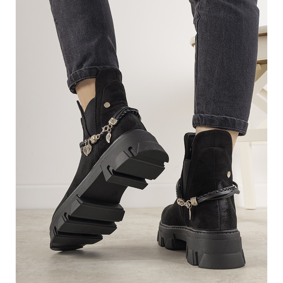 Les bottes noires avec un bracelet Fearless sont un choix parfait pour la prochaine saison automne-hiver. Ces chaussures élégantes, fabriquées en cuir suédé écologique de haute qualité, allient élégance et caractère unique. Leur effet usé sur le bout ajoute de l'originalité et leur semelle haute à motif les rend accrocheurs.