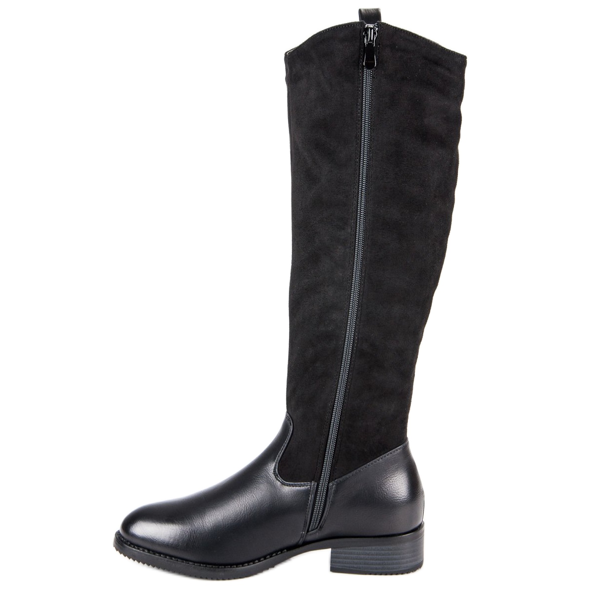 Les bottes noires classiques sont le choix parfait pour les journées d’hiver, alliant élégance et confort. La tige haute, atteignant près de 40 centimètres, protège parfaitement les jambes du froid. Grâce à l'utilisation d'une semelle en plastique avec bande de roulement, ces chaussures peuvent être utilisées en toute sécurité même sur des surfaces glissantes.