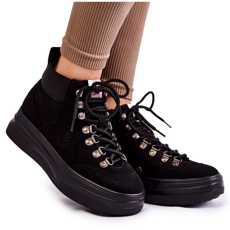 Ce modèle se caractérise par un laçage classique à lacets ronds, qui assure un ajustement parfait au pied. De plus, les talons renforcés garantissent la stabilité et une plateforme épaisse et massive d'une hauteur de 4,5 cm assure le confort de marche, sans sacrifier le look tendance. Dotées d'un talon plat, ces bottines sont parfaites pour les longues promenades ou les journées intenses en ville.
