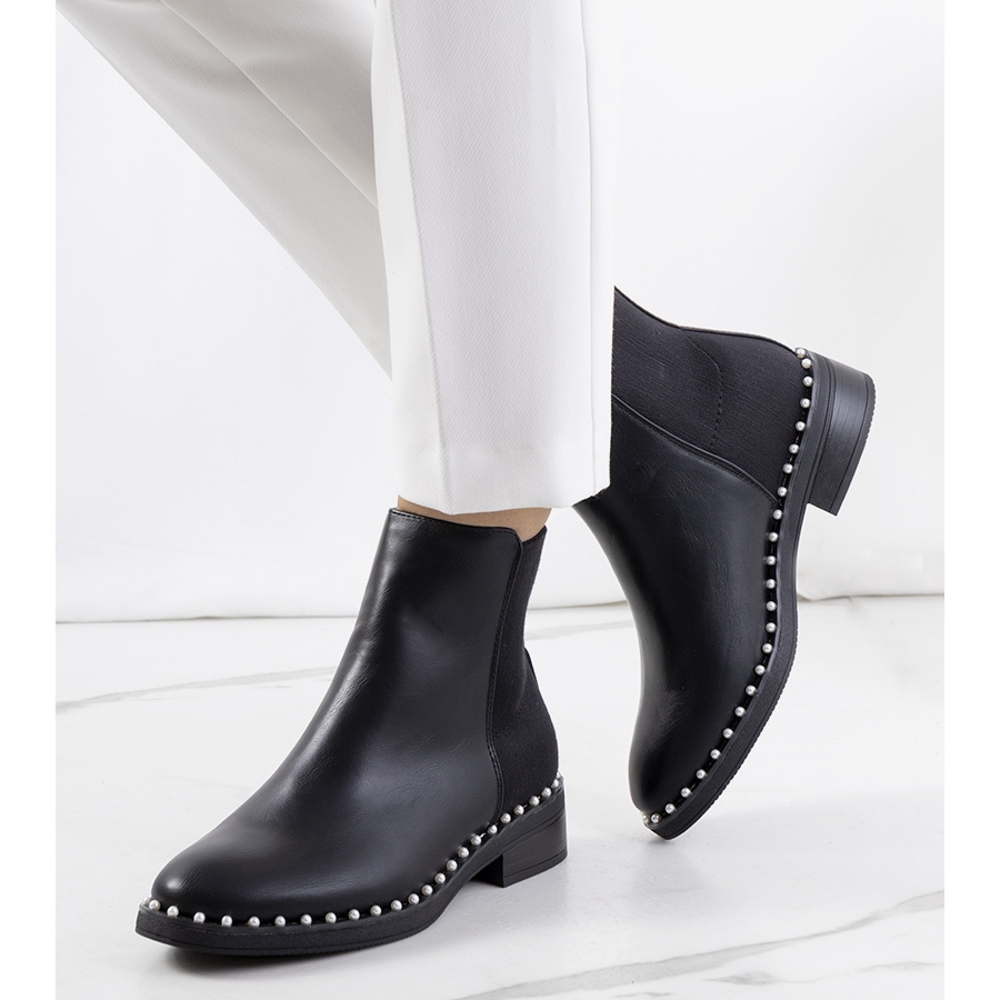 Les bottes d'élégants et de pincella déchaînées sont un complément parfait aux stylisations d'automne et d'hiver. Une coupe à carreaux classique avec une tige de cheville irrégulière et une boucle pratique qui facilite la réconfort avec une finition à la mode. Un talon délicat de 3 cm et une semelle plate en caoutchouc décorée d'imitation des perles ajoutent un caractère subtil aux chaussures, et les strass et les goujons mettent l'accent sur le caractère moderne du modèle.